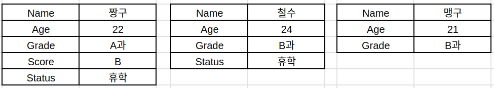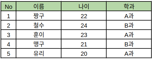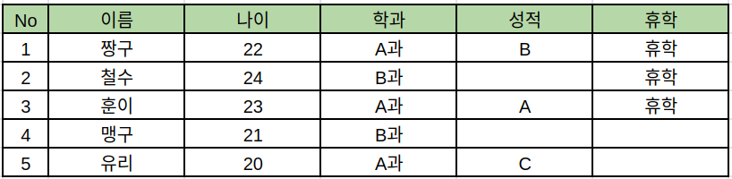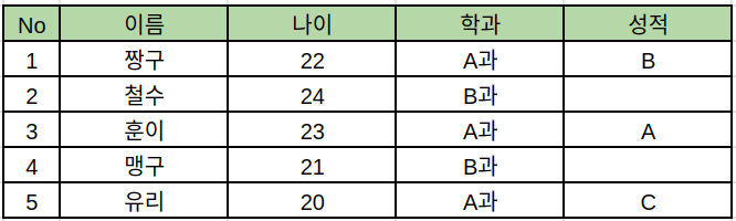 이름별로 나이와 학과 등이 작성된 모습입니다. 이중에서 A과만 시험을 보게되어, A과의 성적이 추가된다면 아래와 같겠죠